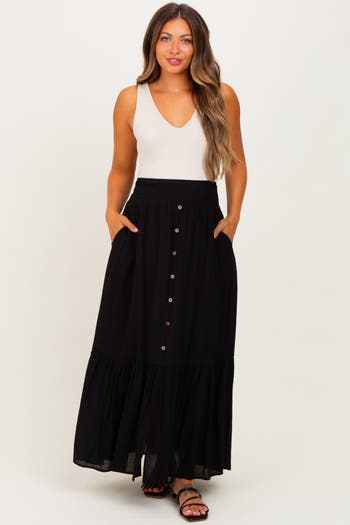 Elevate your maternity wardrobe with our Black Smocked Waist Button Accent Maxi Skirt. Designed for ultimate comfort and style, this skirt features a stretchy smocked waistband that gently hugs your growing bump while providing a flattering fit. The button-down front adds a charming accent and easy adjustability throughout your pregnancy. Crafted from lightweight, breathable fabric, it flows gracefully to the ankle, perfect for any season. Complete with convenient side pockets for essentials, this versatile skirt pairs effortlessly with your favorite tops and sandals for a chic, laid-back look. Perfect for everyday wear or special occasions.