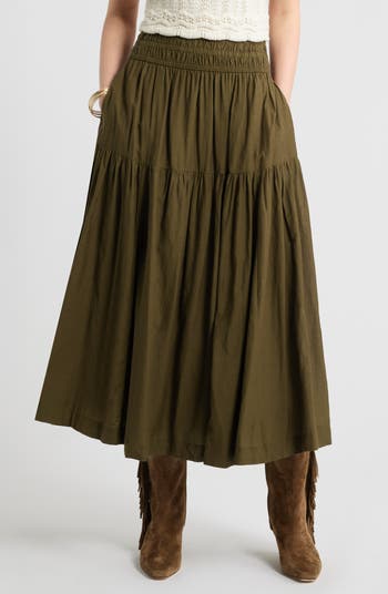 A wide smocked waistband provides gentle shaping in this voluminous maxi-length skirt.