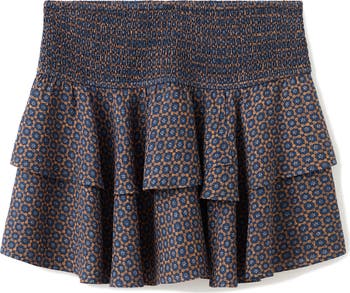 Fanciful layered ruffles flutter on this skirt covered in a polished print and topped with a comfy smocked waist.