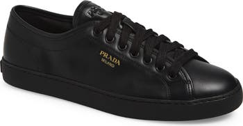 A glinting goldfoil logo shines on a monochrome sneaker crafted from luxurious Italian calfskin.