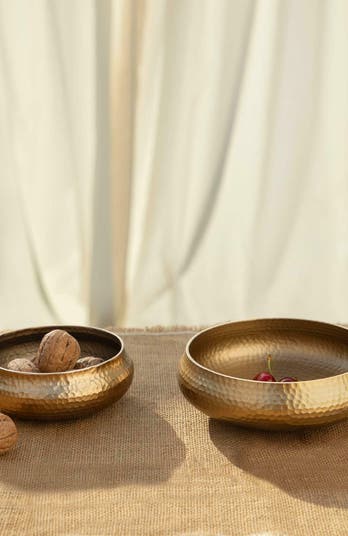 No bar is complete without small bowls to offer guests light bites in between sips. Our round, slightly flared Pebbled Snack Bowls are sold in a set of two practical sizes, handcrafted from brass-finished, nickel-plated aluminum and detailed with a softly dimpled texture. Fill them with nuts or crackers or keep citrus wedges and olives handy while preparing libations. These food-safe dishes should be washed by hand to preserve their finish.