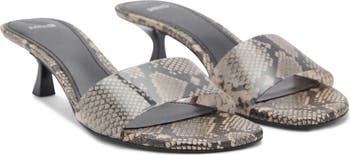 A snake-patterned upper creates a fierce aesthetic on a minimalist slide sandal lifted by a sculptural kitten heel for a hint of height.