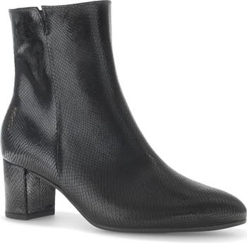 Subtle snakeskin embossing and a notched topline bring sophistication to a sleek leather bootie set on a stacked block heel.