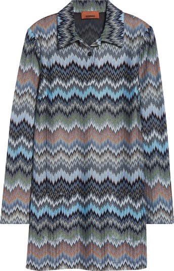 Iconic since their mid-century debut, Missoni's signature zigzags bring kaleidoscopic color to this polo minidress in an openwork raschel knit meant to mimic the scales of snakeskin.