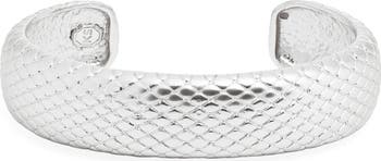 A snakeskin texture dials up the modern appeal of a thick cuff bracelet done in a high-shine finish to illuminate your stack.