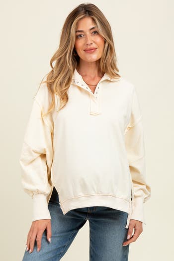 Cozy up in style with our Snap Button Pullover Henley Maternity Sweatshirt. Designed for comfort before, during, and after pregnancy, this ultra-soft sweatshirt features a henley neckline with functional snap buttons—perfect for nursing and easy layering. The relaxed fit gently drapes over your growing bump while ribbed cuffs and hem add a chic finish. Whether you’re lounging at home or running errands, this versatile pullover will become your go-to. Pair it with your favorite leggings or jeans for effortless, everyday maternity style!