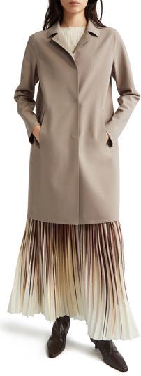 The Italian label's impeccable craftsmanship and aesthetic of understated elegance is on display in a nylon-blend scuba-knit coat with a clean, minimalist placket.