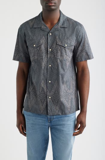 Earn your spurs, sartorially speaking, in this lightweight cotton shirt steeped in classic Western codes—from the angled chest pockets to the enameled snaps and heritage print.