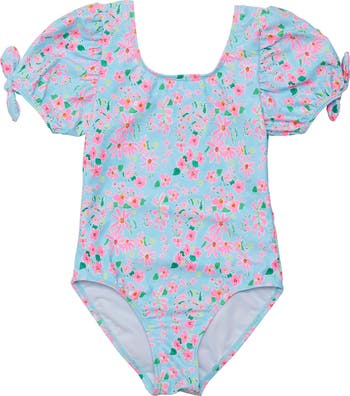 They'll love the playful puff sleeves of this one-piece swimsuit featuring a floral theme and built-in sun protection.