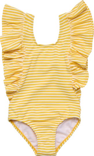 Get them ready to splash and play in this boldly ruffled one-piece swimsuit that's made of lightweight seersucker with built-in sun protection.