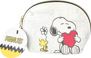 Organize in Peanuts style. This cosmetic bag includes a large zip pouch with Snoopy hugging a heart and a coordinating comic-strip mini. Soft, wipe-clean exteriors and smooth zippers make travel and everyday touch-ups easy. Slide into totes or carry on its own.