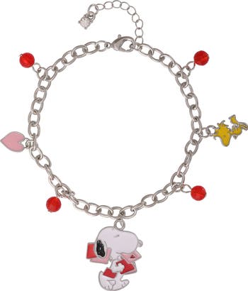 Sweet, storybook sparkle. Snoopy and friends dangle from a silver-tone chain with glossy red bead accents. Wear solo for a playful focal point or layer with trending stacks. Adjustable extender for perfect placement.