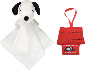This officially licensed Snoopy two-piece gift set includes one security blanket/lovey and one door knob pillow embroidered with the words “Happiness is...A Long Nap.” The doorknob pillow features Snoopy’s iconic red dog house with Snoopy napping comfortably on his favorite blankie. The security blanket lovey is 12 inches by 12 inches and is made in a soft white coral fleece material. Snoopy’s head and arms are white velour, his eyes and brows are embroidered in black, and his nose and ears are black velour. He is wearing a red ribbon around his neck and makes the best baby shower gift or welcome home baby gift for any Peanuts fan.