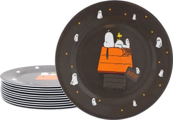 The Peanuts Snoopy Pumpkin 12-Piece Melamine Dinner Plate Set adds a festive and playful touch to your Halloween gatherings. Featuring a charming Snoopy pumpkin design set against a sleek black background, these plates bring both character and seasonal cheer to the table. Each plate measures 10.5 inches, making them perfect for serving meals, snacks, or party treats during the spooky season. The lightweight melamine construction makes them easy to handle while offering durability for repeated use.This 12-piece set provides plenty of plates for family meals, parties, or entertaining guests, ensuring everyone can enjoy the holiday spirit together. Designed with convenience in mind, the plates are safe for cleaning on the top rack of the dishwasher, making post-meal cleanup quick and easy. Please note that they are not microwave safe, preserving their quality and design. Fun, functional, and festive, this Snoopy Halloween plate set is a delightful way to celebrate the season with family and friends.