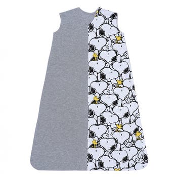 Keep your little one warm, cozy, and stylish in this adorable Snoopy and Woodstock breathable cotton jersey wearable blanket. This comfy sleepsack is more than a blanket; it is a wearable hug that lets your baby move and explore while staying perfectly cozy. Made in 100% cotton jersey, it is soft and breathable and is delicate on baby’s sensitive skin. The right side features multiple Snoopys in a trendy sketch style with little yellow Woodstocks adding to the charm. The left side and back is a heather gray cotton jersey and the 20” long zipper is concealed by a placket.