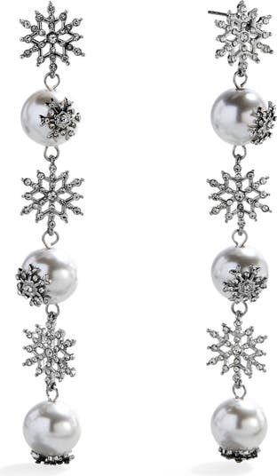 Shine the whole season through with these festive drop earrings, where lustrous faux-pearl baubles and crystal-dazzled snowflakes catch the light with every head turn.