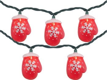 Sweeten up your holiday decor with these festive lights. These lights have red mitten covers with silver snowflakes that create a unique glow to the surrounding area. Perfect for adding some holiday magic to your wreaths, trees, garland, or for lending some sparkle to your indoor or outdoor space. Product Features: Color: clear bulbs / green wire Number of bulbs on string: 10 Bulb size: mini Spacing between bulbs: 10" Lighted length: 7.5' Approx total length: 10' 24" lead cord 5" tail cord Additional product features: Steady burning bulbs UL certified and approved for indoor or outdoor use Contains 1 plug with end connector allowing you to stack multiple sets of lights together (not to exceed 210 watts) Comes with spare replacement bulbs and fuse 120 volts, 60 hertz, .07 amps, 8.4 watts Material(s): glass bulbs/plastic light covers/wire