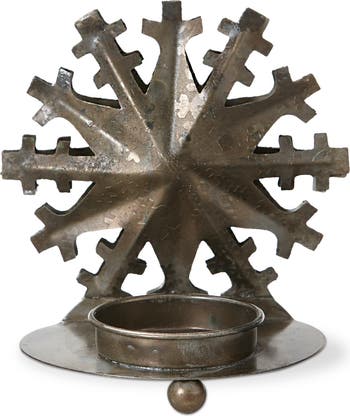 Let it snow! Warm candlelight is a crucial element to home decor & design. This artisan-made snowflake candle holder features iron construction with burn brass finish. Holds standard size metal, clear cup or led tealight, sold separately.