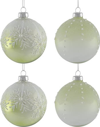 Add a touch of winter wonder to your Christmas tree with our glass ball ornaments. In elegant shades of green and white, these ornaments bring a classic charm to your holiday decor. One features delicate white snowflakes glistening with glitter, while the other dazzles with rows of sparkling white polka dots. Elevate your holiday atmosphere with these enchanting decorations, perfect for a merry and bright season. Product Features: 4-piece set Color: green and white Balls are equipped with silver ornament caps Come ready-to-hang on silver cords Dimensions: 3" (80mm) Material(s): glass/metal Note:Set includes 2 of each item shown; total of 4 ornaments