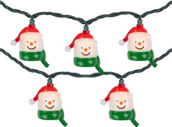 These adorable lights with a festive snowman design will melt your heart. Each snowman is ready for the cold weather wearing a Santa hat and green scarf. Let these snowman's smiling faces add some holiday flair to your trees, garland, or around your doorways. Product Features: Color: clear bulbs / green wire Number of bulbs on string: 10 Bulb size: mini Spacing between bulbs: 10" Lighted length: 7.5' Approx total length: 10' 24" lead cord 5" tail cord Additional product features: Steady burning bulbs UL certified and approved for indoor or outdoor use Contains 1 plug with end connector allowing you to stack multiple sets of lights together (not to exceed 210 watts) Comes with spare replacement bulbs and fuse 120 volts, 60 hertz, .07 amps, 8.4 watts Material(s): glass bulbs/plastic light covers/wire