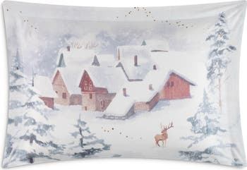 - The white background of the pillowcase is decorated with a watercolor-like picture showing a winter landscape with snow-covered houses in the forest, fluffy fir-trees and a gorgeous reindeer family.