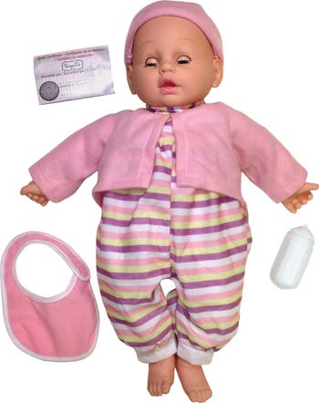 BABY'S FIRST: SO BIG BABY DOLL - STRIPED PAJAMAS - Our baby comforts your baby! Our Baby's First So Big Baby in Striped Pajama Outfit is the perfect billowy, comforting companion for your or a loved one's child. So Big Baby dolls comes dressed in adorable downy 2-piece pajama sets featuring charming patterns and a matching headdress. Each ensemble includes a bib, a baby bottle, and a birth certificate, adding to the realistic play experience. With her sleepy-time eyes, So Big Baby is the perfect cuddle buddy for nap time, making her an ideal companion for playtime, learning time, and sleepy time. Whether for imaginative play or soothing comfort, So Big Baby is the perfect doll for every moment of your little one’s day! Our product is designed for easy care with a surface-washable feature. Simply use a warm, damp cloth to gently clean and maintain its freshness. Create sweet, life-long memories with our So Big Baby dolls. Happy babies, happy moms! Smart Age Rating: Our Hug & Luv undergoes independent testing to ensure it meets the highest safety standards for the appropriate age grade, providing peace of mind for parents and a secure play experience for your child. Perfect for children 2 years and up. INCLUDES: 19" Soft Body Doll, Baby Bottle, Baby Bib, Matching Headband & Matching Jacket.