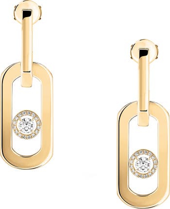 Pared-back graphic lines bring modern elegance to earrings sparked with haloed, claw-set diamonds that move within the oval pendant of 18-karat gold.