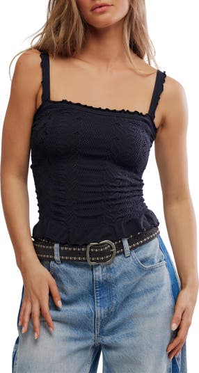 Eyelet details and curly lettuce edging further sweeten this tank cut from a buttery soft knit rich with tactile patternwork.