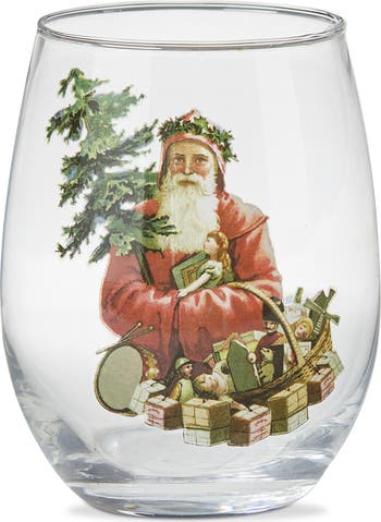 this Santa stemless glass is a fun and festive addition to your holiday decor. the glass features a design of Santa in red and green, perfect for enjoying your favorite wine on Christmas eve.