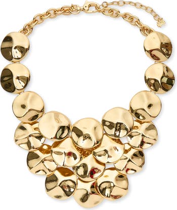 Make a statement in this bold bib necklace designed with hammered discs that appear to cascade in a tumble of golden light.