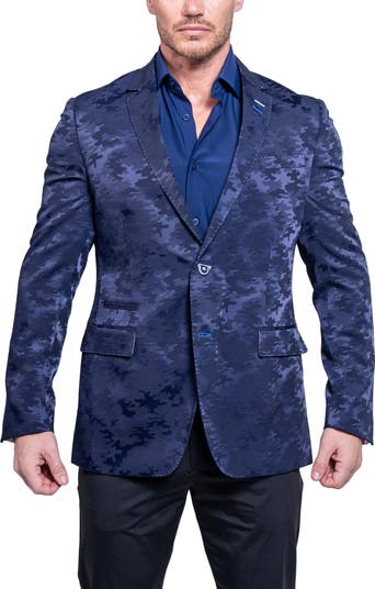 A camo jacquard design and contrast topstitching detail this sleek blazer playfully finished with a bold contrasting lining.