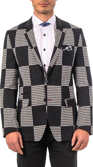 A crisp checkerboard pattern and contrast topstitching detail a modern blazer fashioned from a wool-warmed blend. A pup-printed square is sewn into the chest pocket for a last playful pop that's echoed in the lining.