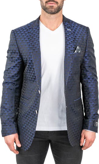 Turn heads in this lustrous, skull-patterned blazer showcasing a built-in pocket square and a trimmer fit around the arms and chest.