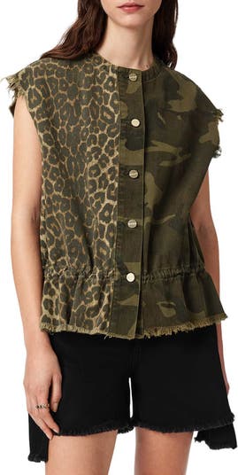 Fight for your fierce style in an edgy vest patterned in wild leopard and cool camo, all finished with unfinished hems.
