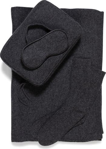 Travel first class no matter where your seat assignment is with this luxuriously soft, warm cashmere blanket, pouch, eye mask and socks set.