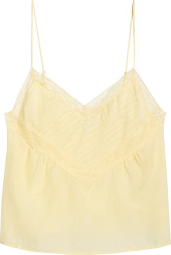 A tonal striped yoke introduces subtle dimension to this lace-trim camisole made from a lightweight cotton-and-silk blend.