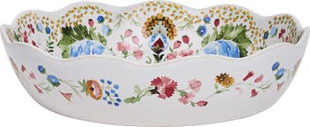 Make salads, pastas and side dishes look even more enchanting with this scalloped ceramic serving bowl patterned in filigreed flora worthy of a fairy-tale soirée.