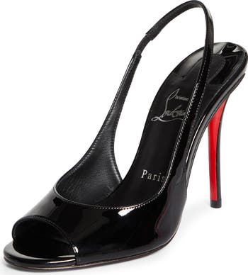 The softly tapered and strikingly sleek silhouette of this slingback pump pairs patent calfskin leather with a retro peep-toe vamp. A slender stiletto lifts the style and displays the Everlasting Red sole—an innovative finish engineered for resistance and lasting vibrancy of the signature hue.