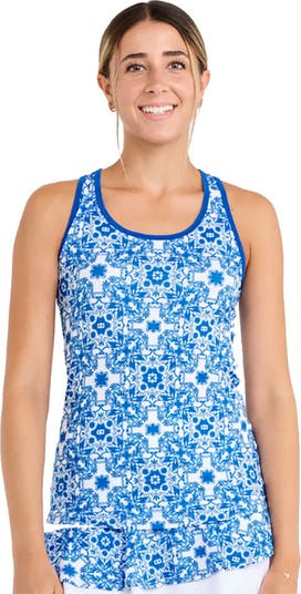 The Sofibella Miss Santorini 25-Inch Racerback Women's Tennis Tank blends Mediterranean-inspired style with high-performance features. Adorned in the exclusive Sandra Tiles print, this tank showcases a scoop neckline, contrast binding, and a laser-cut mesh racerback insert for enhanced breathability and a modern aesthetic. Crafted from Sofibella's signature performance fabric, it offers UPF 50+ sun protection, moisture-wicking properties, quick-drying functionality, four-way stretch, and resistance to pilling, ensuring comfort and durability during intense matches.