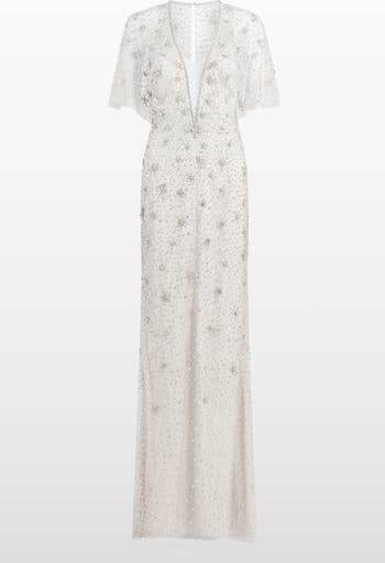 Ethereal and intricately detailed, this designer bridal gown embodies modern romance with a touch of celestial elegance. The plunging neckline and sheer flutter sleeves create a soft, graceful silhouette that feels both delicate and refined. Intricate beadwork and star motifs shimmer across the fabric, adding texture and light from every angle. Finished with a gentle train, it captures the essence of contemporary bridal glamour and timeless sophistication.