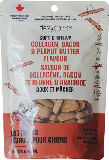SOFT & CHEWY: COLLAGEN, BACON & PEANUT BUTTER - 8oz bag dog treats - Support your dog’s health from the inside out with our Collagen Soft & Chewy Treats—a delicious, nutritious reward your pup will love. These flavorful bites are more than just treats—they’re a thoughtful way to support mobility, skin health, and coat shine, all in one tasty chew. Packed with premium functional ingredients, each 8oz bag delivers a blend of flavors and benefits your pet will crave. Collagen plays a key role in maintaining joint flexibility and strength, while promoting skin elasticity and a shiny coat. The soft, chewy texture makes these treats easy to digest, making them ideal for dogs of all breeds and life stages. Made with simple, wholesome ingredients including barley, turkey, coconut oil, beef liver, and rosemary extract. Whether you’re using them for training, rewarding good behavior, or a daily snack, these treats are a delicious way to show your dog love while supporting their long-term wellness. Give your dog the benefit of flavor and function in every bite. Soft, tasty, and highly digestible—these treats are the wholesome way to reward your best friend. INGREDIENTS: Barley, Turkey, Coconut Glycerin, Cane Molasses, Coconut Oil, Natural Flavor, Collagen, Bacon Flavor, Peanut Butter, Beef Liver, Mixed Tocopherols (preservative), Rosemary Extract, Sunflower Lecithin