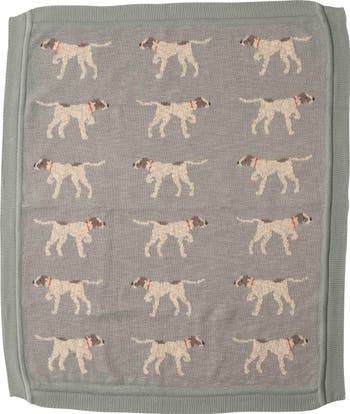 - A cozy and cute cotton knit blanket that features a blue color and a dog design, creating a fun and playful look