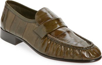 An eelskin-leather upper brings unique softness, suppleness and subtle striping to this moc-toe loafer with a grip-enhanced suede sole.