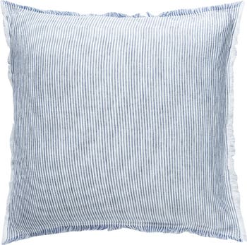 Our Blue Pinstripe Fringe Linen Pillow is Soo soft- you won't believe it's linen! This yarn has a slight nub which gives it a beautiful natural texture. Edges have a self-fringe on all sides. Details. Front & Back Color: Blue & White Pinstripe. Front & Back side: 100% Linen (washed) Concealed zipper closure on back side. Hand washing or a delicate cycle with like colored fabrics recommended. Hang to Dry. Made in India