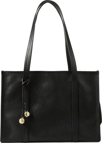 Soft leather tote bag with long shoulder straps, magnetic clasp, side pocket and charms.