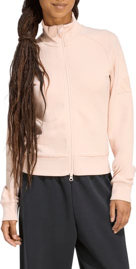 Peached spacer-knit fabric brings structure and soft comfort to this track jacket cut in a slim fit and styled with underarm gussets and a two-way zipper for styling and activity versatility.