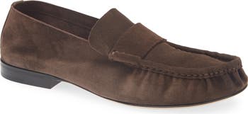 A covered moc toe and plain keeper bring the label's sophisticated sensibility to a minimalist loafer fashioned from chocolate-colored Italian suede.