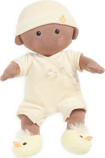 A removable outfit and diaper lend playful charm to this organic-cotton baby doll that's stuffed with hypoallergenic fill. With embroidered features, stitched-on slippers and no small parts, this soft friend is thoughtfully designed to delight all ages.
