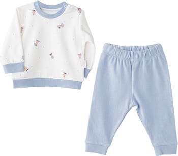 A cozy duo designed for everyday comfort and playful charm, perfect for little explorers with big imaginations. Printed long-sleeve top with colorful animal characters and light blue trim. Plush light blue pants with elastic waist and ribbed cuffs for easy movement. Coordinated tones and soft textures make it ideal for indoor play or outings.