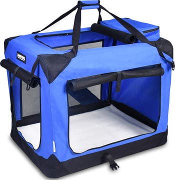 JESPET SOFT DOG CRATE - 36" BLUE - Security - Foldable - Breathable - Portable - Give your Lovely a comfortable retreat anywhere. Whether you’re traveling on vacation or taking your pet on a dreaded trip to the vet, soft pet crate provides a safe, cozy, private home for your lovely friend. (Dogs, Puppy, Cats, Rabbits, Hedgehog, Guinea Pig). This fully collapsible doghouse is comprised of a well-ventilated mesh cover and a heavy-duty yet lightweight steel bar frame. It easily folds up and down for effortless setup and quick storage. The crate’s versatile design makes it ideal for bringing your pal along on quick errands or for longer trips, providing a quiet, comfy sanctuary they’ll surely love. OVERVIEW: Portable, folding, 3 entrance doors, mesh sides, durable washable fabric, fleece bed, indoor & outdoor. Pets up to 70 lbs. Size: 36"L x 24"W x 27"H.